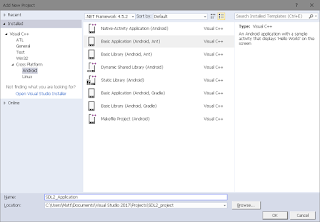 To run SDL2 on Android a second project needs to be created which provides a java activity that invokes the native code. The code for this is provided in the SDL2 source archive but, again, requires some setup to work with Visual Studio. Add a new project to the solution, this time selecting the template for Basic Application.