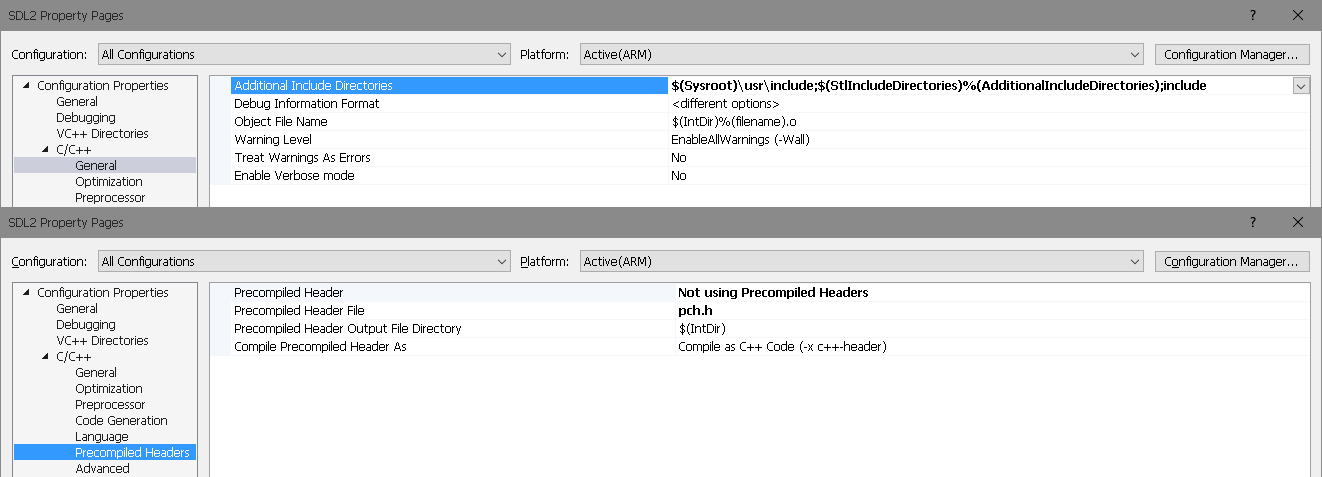 This will provide the basis for what's needed to build SDL2 as a shared library, although a few settings will need to be changed. It's also worth noting that the project has four configurations, ARM, ARM64, x86 and x64. Each of these will need the same modifications applied if you intend to use them, although I'll only cover the ARM configuration here. The x86 configuration is useful because these builds can be used with the x86 HAXM accelerated version of the Android emulator which runs much more quickly on a desktop computer than the ARM version.