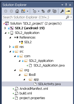 To make sure the code is referenced properly from the java application, right click on the java application project's references node in the solution explorer and select 'Add Reference'. Check the box next to main - SDL2 should already be checked, if not check it too. If your project is named anything other than main - or you're adding another library such as SDL_image - browse to src/org/libsdl/app in the solution explorer and open SDLActivity.java. Around line 72 is an array of library names which will be loaded when the application is run. By default it already contains SDL2 and main, but this will need to be modified to add any extra libraries, or if main is named something else. Note that these are the names of the .so files without the preceeding lib and .so extension.