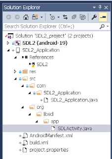 SDL2 projects on Android differ slightly to those created for desktop applications on platforms such as linux or Windows. Generally in these scenarios you link to SDL as you would any other library and start coding away. On Android, however, SDL2 does not run as a native activity application, rather it needs to be linked and invoked via a java activity so that hardware events such as input may be correctly handed down to the native code. Fortunately the SDL author provides the java source file needed within an example ndk project - it just needs a little work to include it in Visual Studio. This means that, at the very least, you need to create two Visual Studio projects - plus a third to contain your own code. If you're also writing a library to share code with other platforms the project count jumps to four, or more if you wish to include libraries such as SDL_image... I shall be concentrating on describing what it takes to build SDL2, link it to an Android java project, and have it display something with some custom code, starting with the SDL2 library. Other libraries should follow the same process more or less.