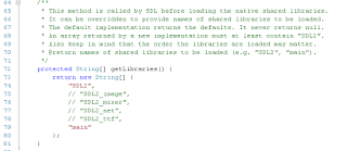 A java file under org.libsdl.app called SDLActivity.java should now be included in the project. Import this to the application java file which was created with the project, then remove the 'hello world' example code. Modify the class so that it now extends SDLActivity.